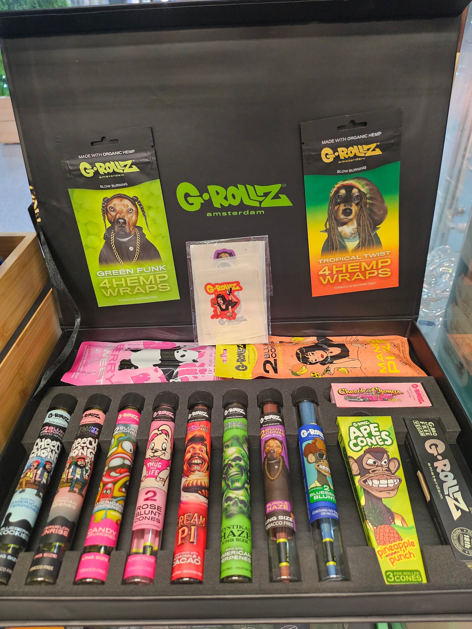 A premium package of G-Rollz Cheech & Chong rolling papers & blunts for the smoking enthusiast who likes variety. This large rolling paper gift set is the ultimate way to enjoy Cheech & Chong x G-Rollz products, with everything you need in one stylish package.